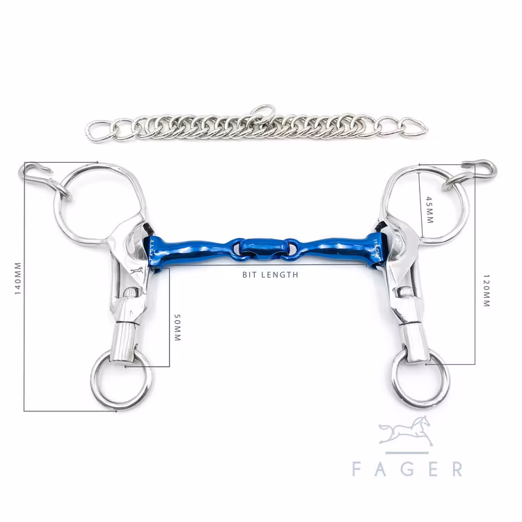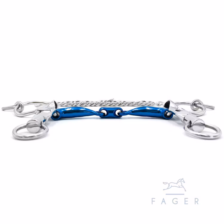 ”Jag var på jakt efter ett tävlingsbett för mig och mina elever som ger en tydlig och klar kontakt till hästen. Det ska vara mjukare och behagligt för hästen att bära utan en allt för stor hävverkan. Jag brukade tävla på Baby Pelham, men som många av mina elever påpekade är det inte alltid så lätt att hantera två tyglar, vilket du måste ha om du ska tävla på Pelham. Tillsammans med Fager, kunde vi ta fram ett stångbett med marknadens kortaste skänklar som även är godkänt att tävla på ett par tyglar. Mittdelen är i ren titan, som så många hästar uppskattar.