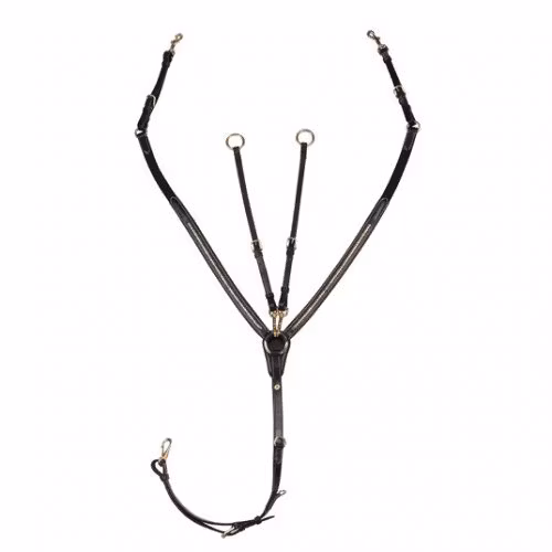 Bröstmartingal med mjuka stoppningar och vackra guldfärgade klinkers. Passar bra tillsammans med klinkertränset. Formad efter hästen och förhindrar skav.
